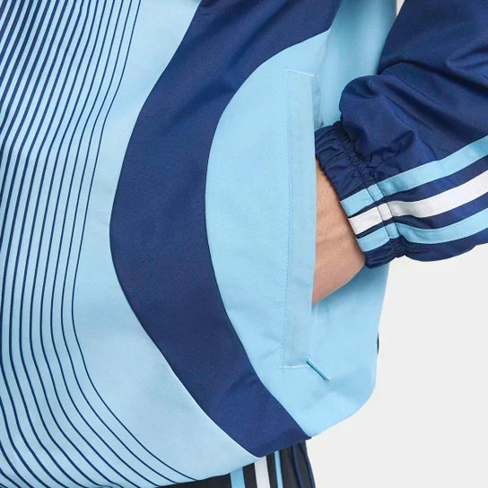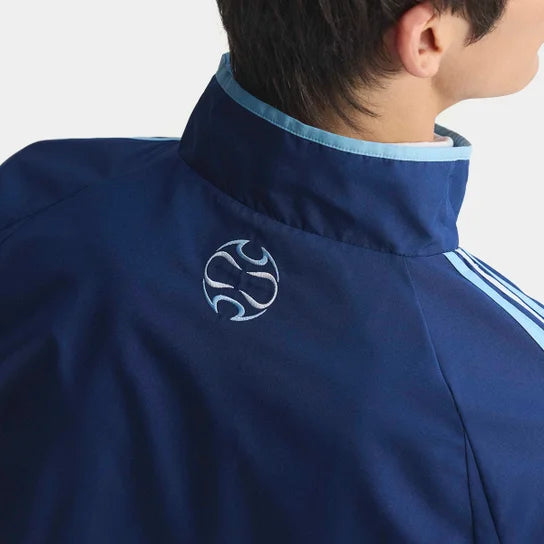 El escudo estampado en el pecho contrasta con el elegante diseño de la cazadora.